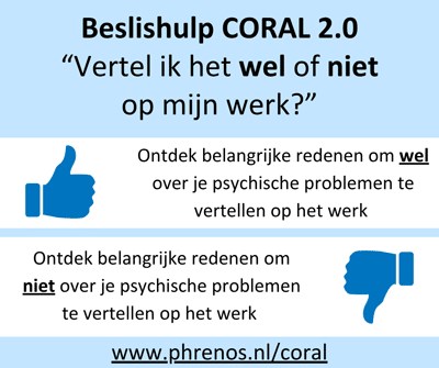 Kenniscentrum Phrenos heeft de digitale beslishulp CORAL (Conceal Or ReveAL) beschikbaar gesteld. De tool helpt om een weloverwogen beslissing te nemen over openheid over psychische problemen op het werk.